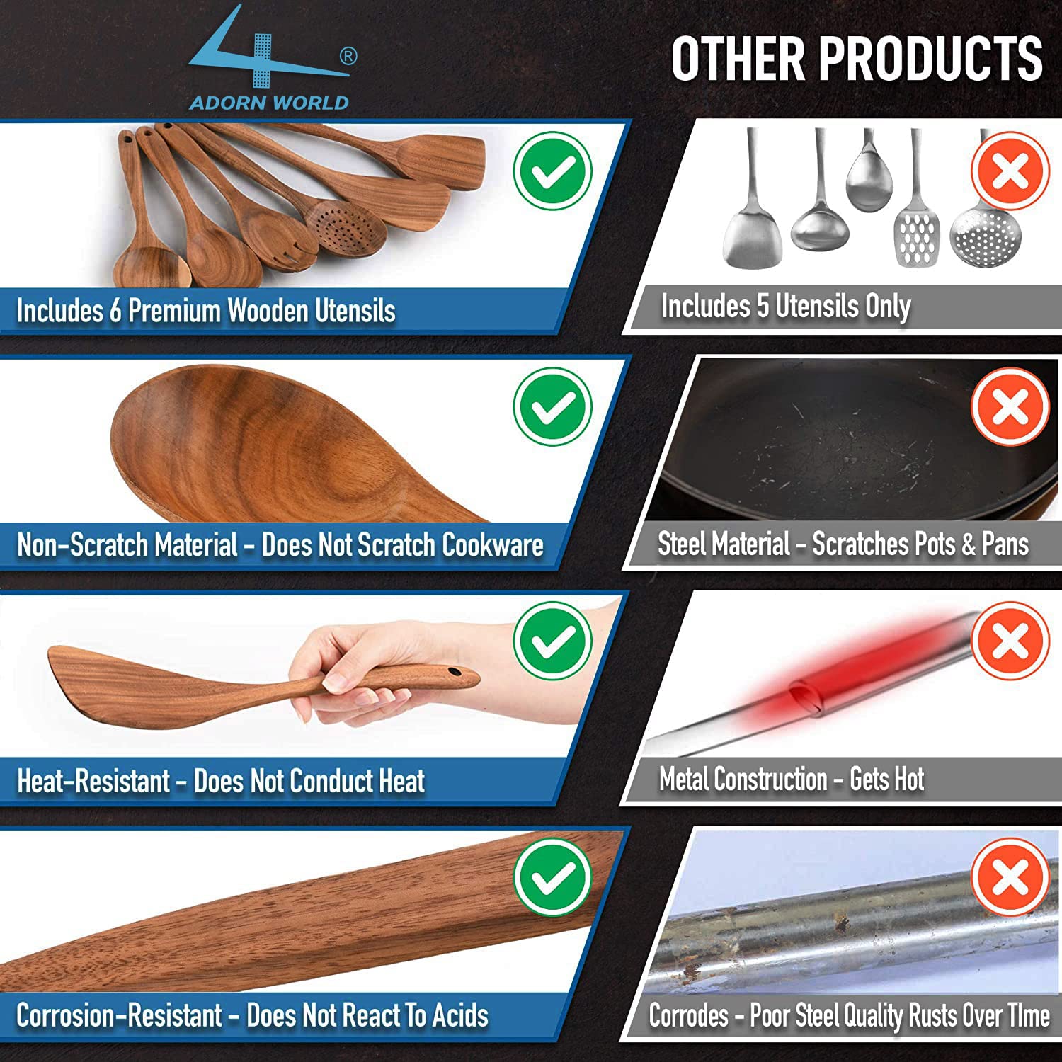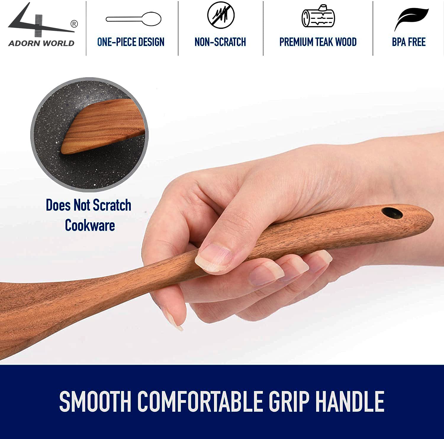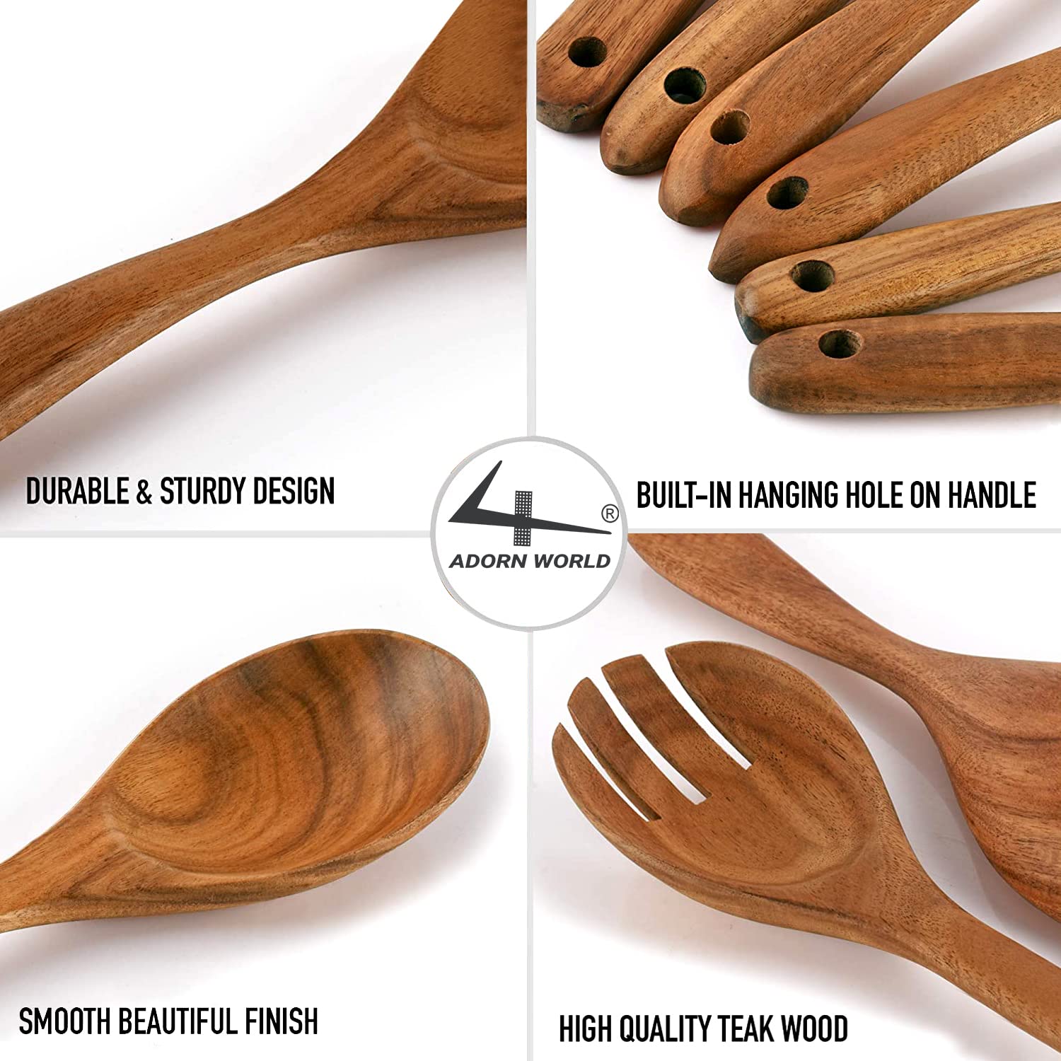 - Does Not Scratch Precious Cookware: The ADORN WORLD Wooden Cooking Utensil Set is made of premium quality Teak wood, close-grained hardwood with high organic oil, and silica content that is known for being one of the hardest, strongest, and most durable of all timbers. Beautifully crafted, soft to touch, lightweight, and very solid basically defines what great workmanship is. Now you can use your precious non-stick cookware without worrying about damages and scratches.